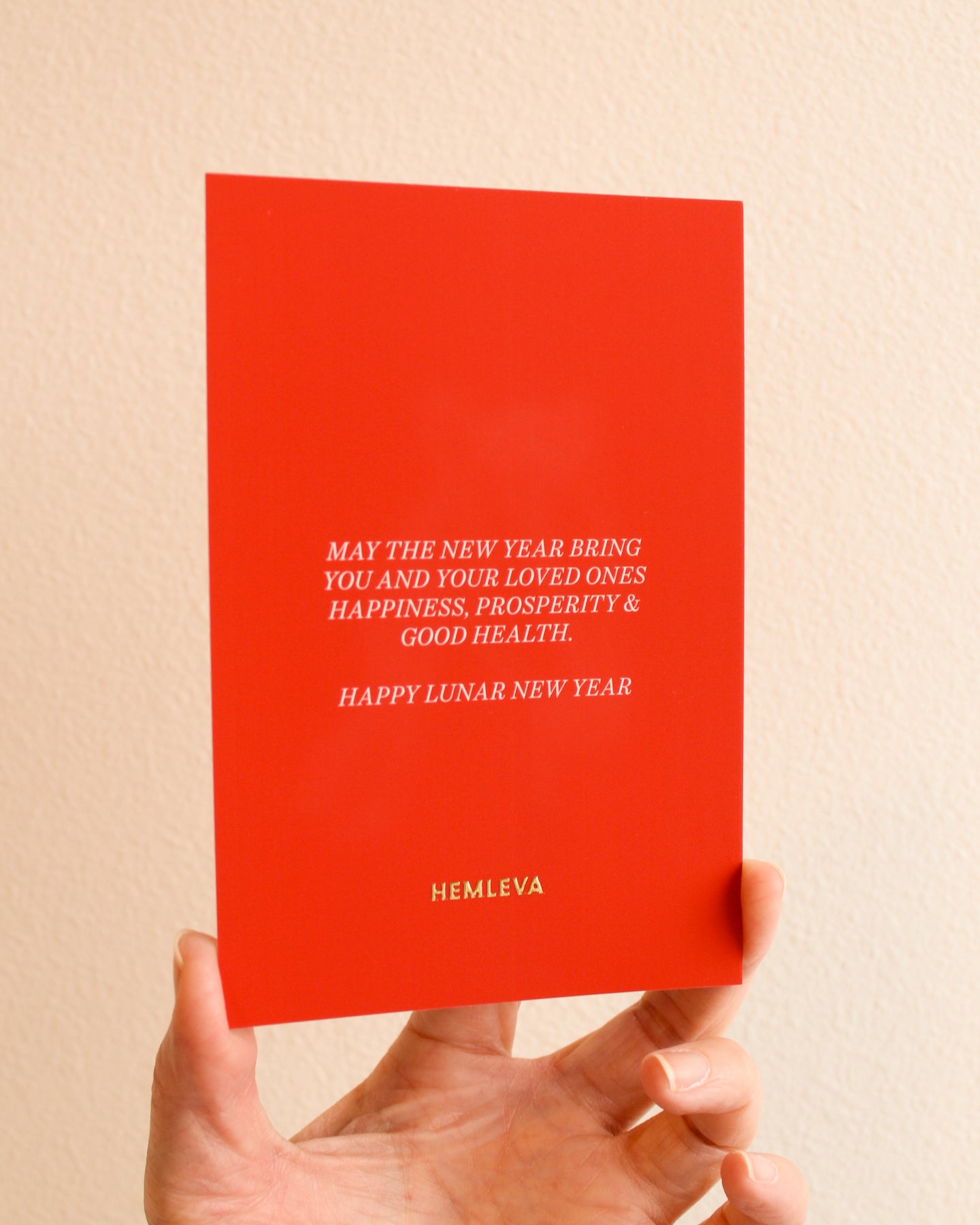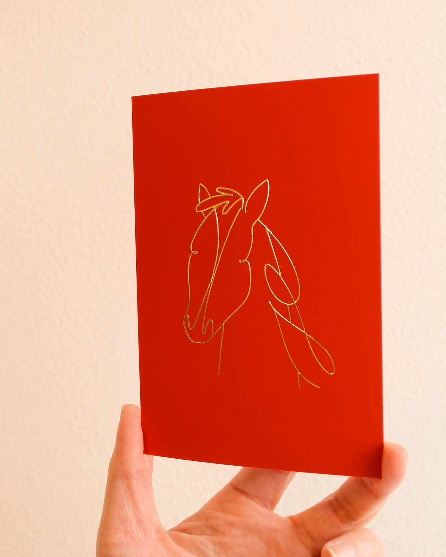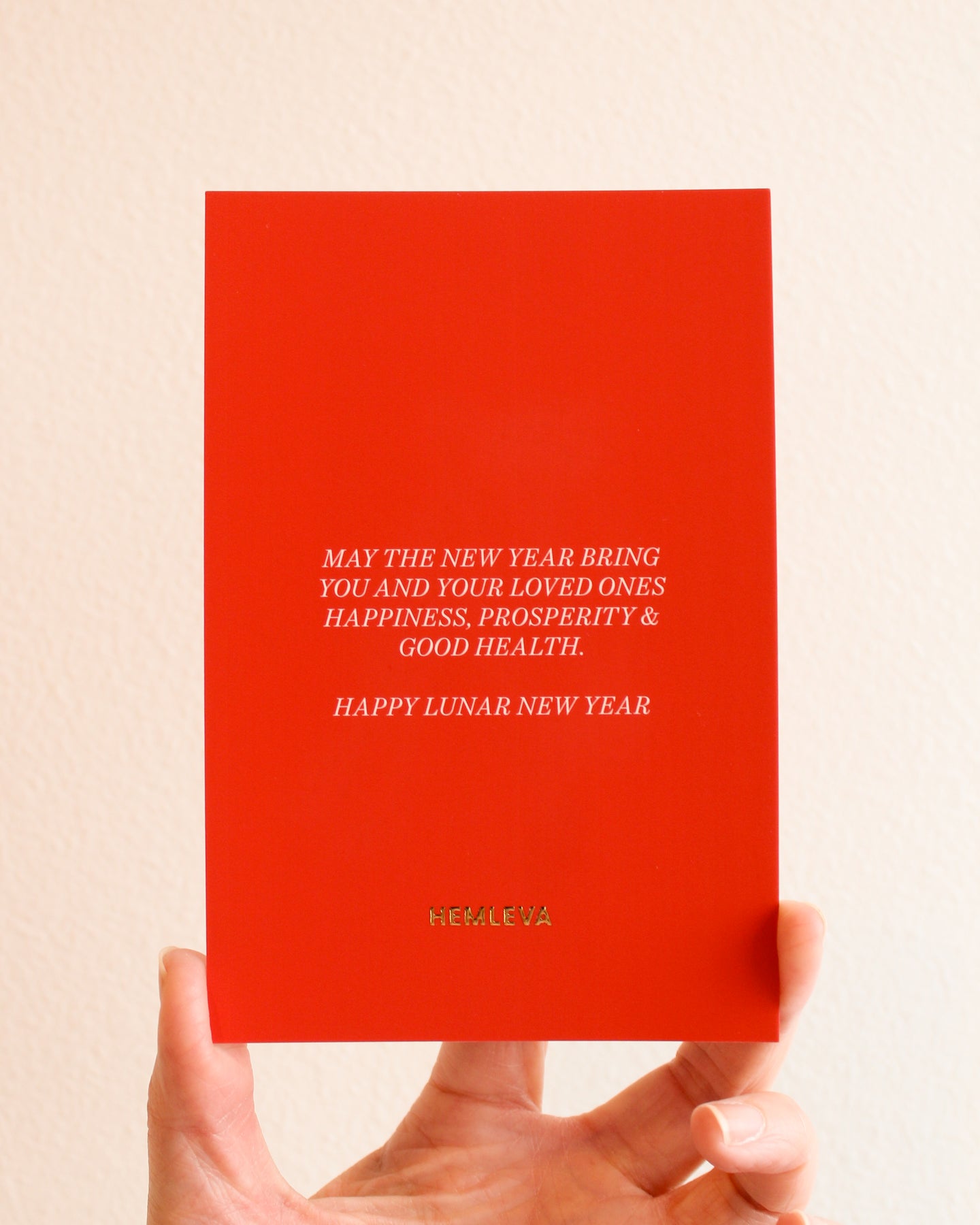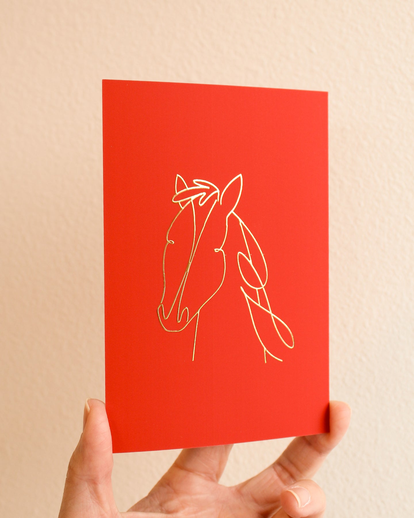 This original HEMLEVA design celebrates the Year of the Fire Horse, a symbol of vitality, independence, and unstoppable momentum. Illustrated with warmth and intention, and finished with luminous gold foil details, this 4x6" card is printed on luxuriously soft-touch 18pt stock for a tactile experience that feels as special as the message on the back.